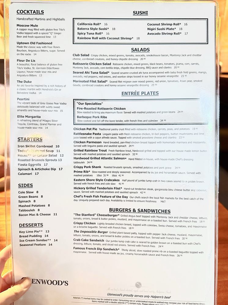 Introducing the menu at Glenwood's - Rockville, a New American-Cocktail Bar in Rockville, MD. This classy, yet casual restaurant offers a range of appetizers, sushi options, and entrée salads. Start your meal with Iron Skillet Cornbread or the Fiesta Eggrolls. For sushi lovers, try the California Roll or Coconut Shrimp Roll. The entrée salads are also a hit, with options like the Club Salad with crispy chicken or the Rotisserie Chicken Salad with a chipotle-blue dressing. Glenwood's provides a variety of vegan and limited vegetarian options, making it a great choice for all dietary preferences. With live music, happy hour specials, and outdoor seating, Glenwood's is perfect for a fun night out with friends or a relaxed lunch or dinner. Don't forget to enjoy their plastic-free packaging and reusable tableware, showcasing their commitment to sustainability.